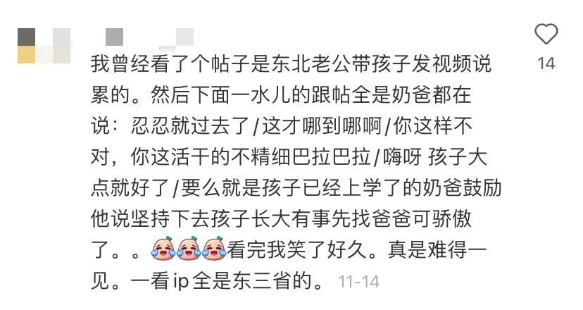 一位新手东北爸爸在网上抱怨带孩子累,评论区的网友有的安慰,有的提供技术性指导,有的帮这位爸爸展望未来,字里行间都是对孩子的爱和作为父亲的骄傲。