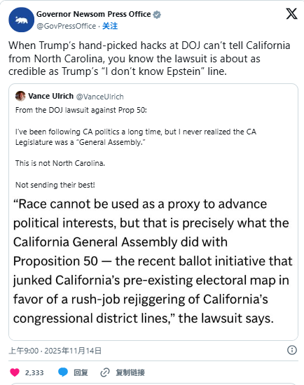 在第三篇帖子中,纽森抨击了特朗普关于他并不认识爱泼斯坦的说法,同时驳斥了司法部针对加州第50号提案(加州选民在11月4日投票通过的选区重划方案)提起的诉讼。