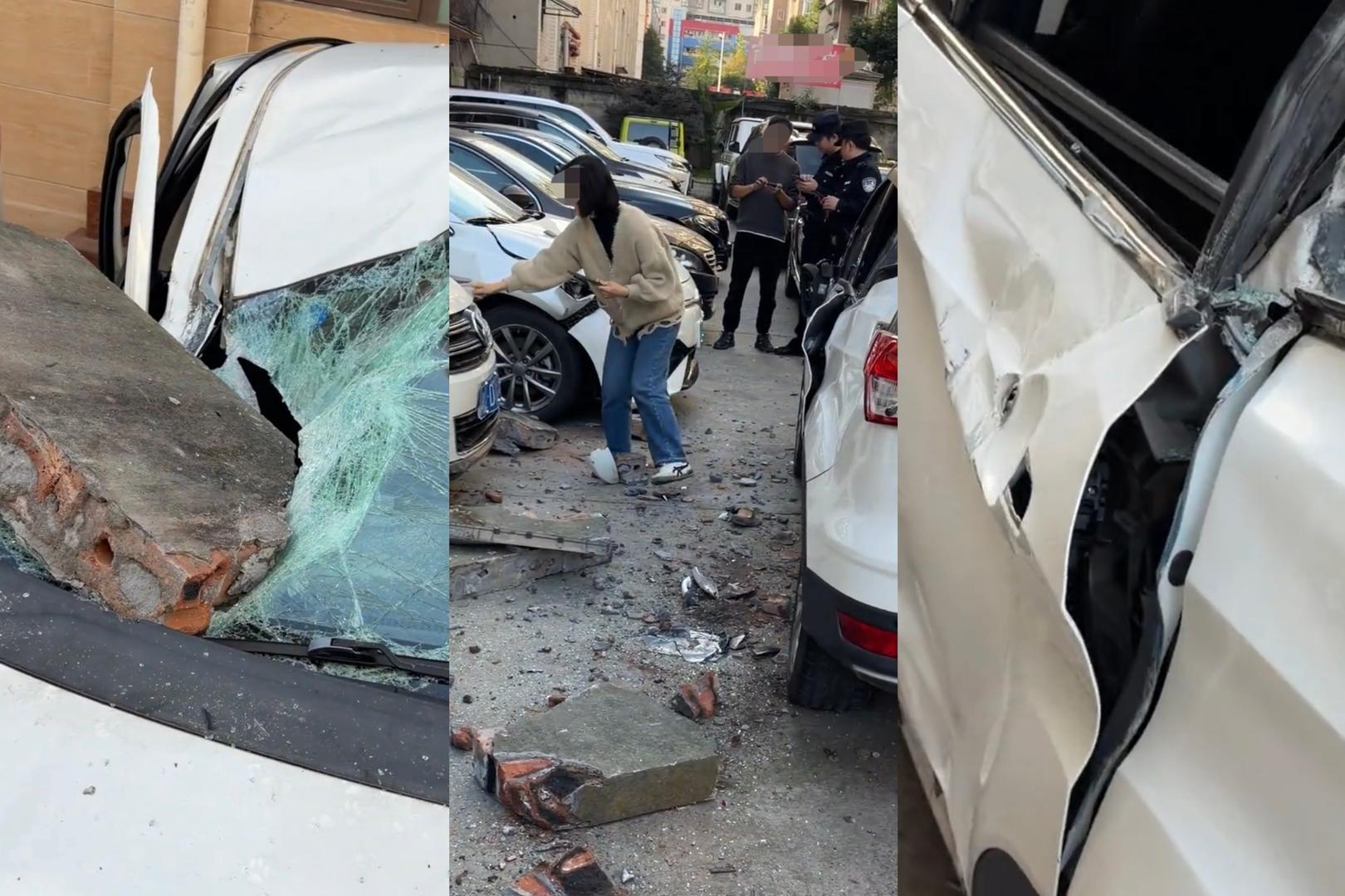 网友拍摄的现场视频显示,有大块破碎的墙体砸中街边停放的车辆,车身和地面散落着不少墙砖残块,有车主正向民警讲述车辆受损情况。其中一名车主表示,他的车辆引擎盖、车门及保险杠被砸坏,现场有3辆车损坏严重,有两辆车损坏得轻些。