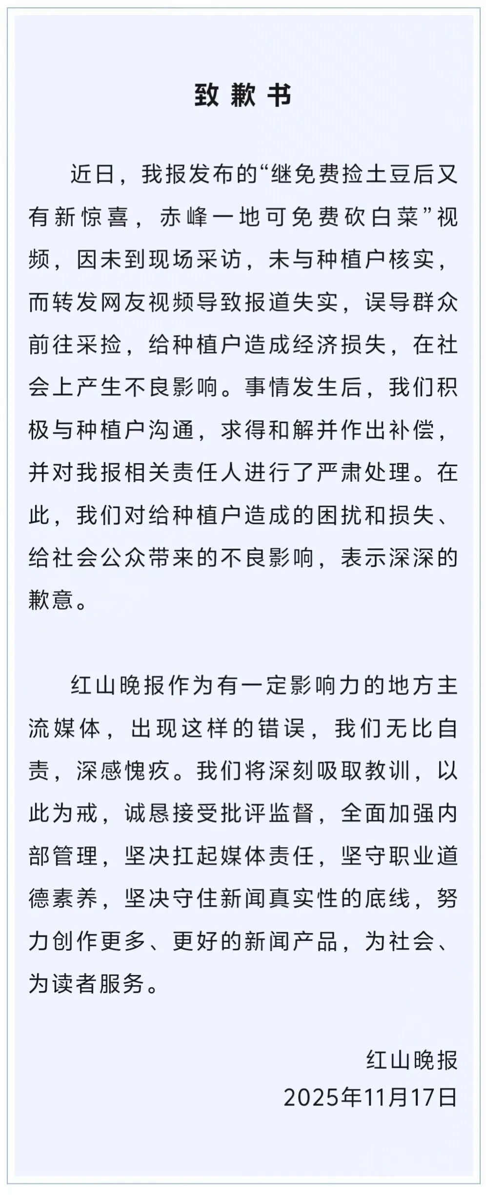 种植户百亩白菜遭哄抢,红山晚报致歉