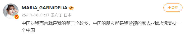 美依礼芽说:“中国对我而言就是我的第二个故乡,中国的朋友都是我珍视的家人——我永远支持一个中国。”