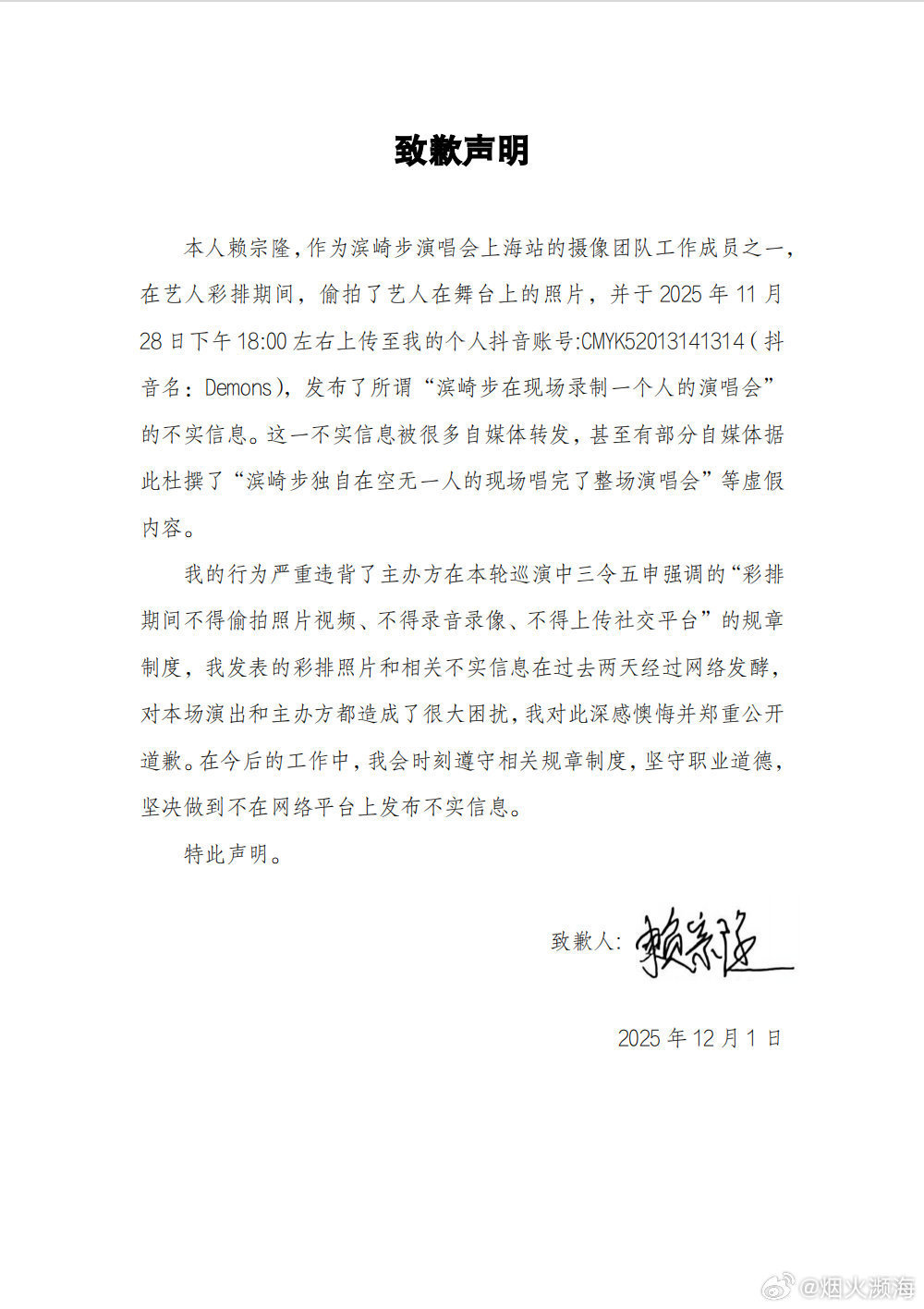所谓滨崎步“一个人的演唱会”信息不实,系彩排期间被偷拍,摄像团队人员公开致歉
