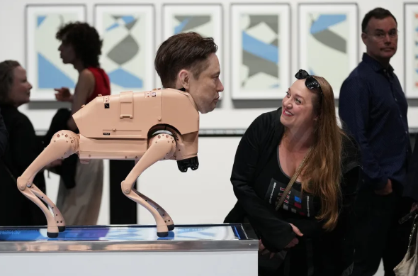 一群机器人四足动物在展厅里踱步,它们脸上戴着科技亿万富翁和著名艺术家们栩栩如生的硅胶面具。其中一个长着酷似埃隆·马斯克,一边绕圈一边抿着嘴。就在它旁边,“安迪·沃霍尔”和“马克·扎克伯格”差点撞到一起。它们时不时地向后仰头,从屁股后面“吐”出一幅印刷好的艺术作品,同时背后的屏幕还会闪烁“排便模式”的提示。这些半人半犬的生物看起来像是赛博朋克游戏里的东西,或是一场噩梦。它们出现在世界上最富有的艺术博览会之一,迈阿密巴塞尔艺术展的展厅里。