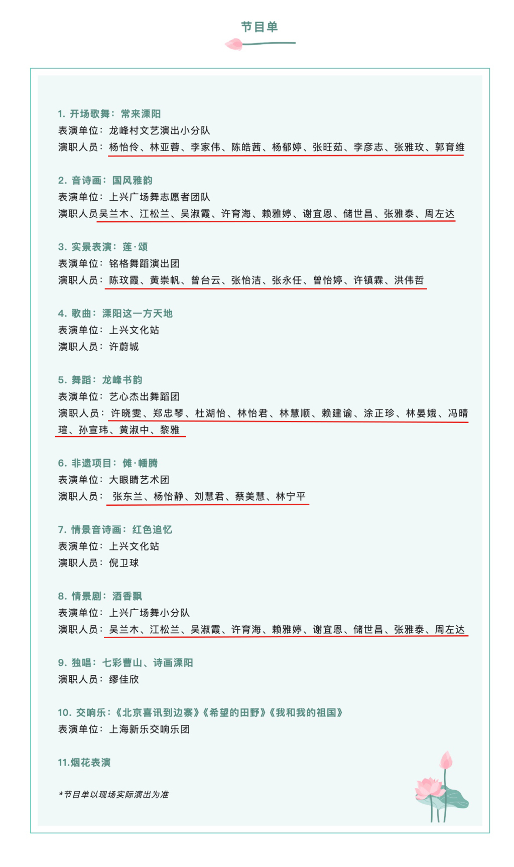 如第一个节目是《开场歌舞:常来溧阳》,节目单显示表演单位为“龙峰村文艺演出小分队”,演职人员包括“杨怡伶、林亚蓉、李家伟、陈皓茜、杨郁婷、张旺茹、李彦志、张雅玫、郭育维”,9个人的名字、顺序与《一万个名字》中开头9人相同。