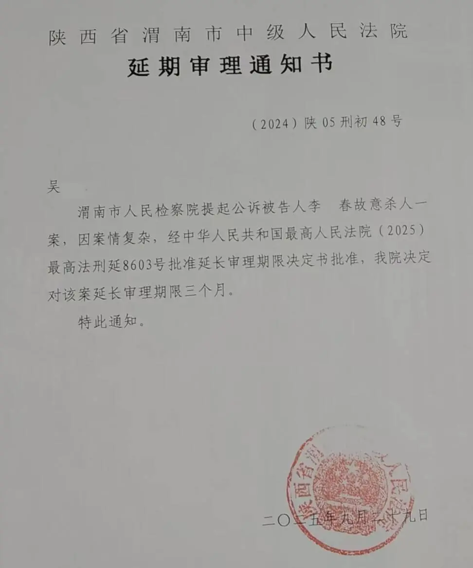 2日晚,受害女子吴某莉的弟弟吴先生称,近日女方家属收到了渭南市中级人民法院寄来的延期审理通知书。通知书指出,渭南市人民检察院提起公诉的被告人李某春故意杀人一案,因案情复杂,经最高人民法院(2025)最高法刑延8603号批准延长审理期限决定书批准,渭南市中级人民法院决定对该案延长审理期限3个月。