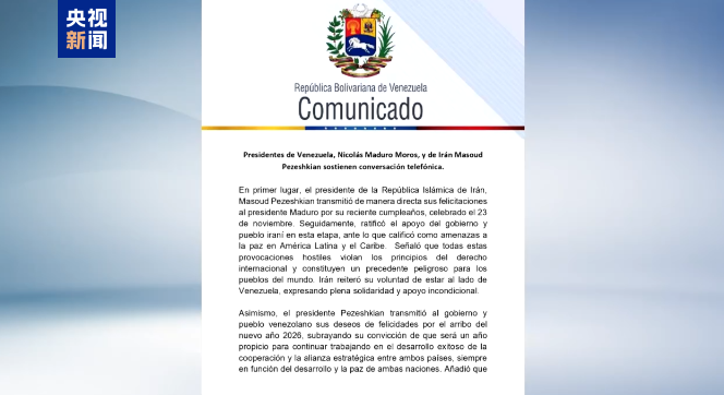 9日,委内瑞拉外交部长希尔在社交媒体上发布政府公告称,委内瑞拉总统马杜罗与伊朗总统佩泽希齐扬进行了电话会谈。