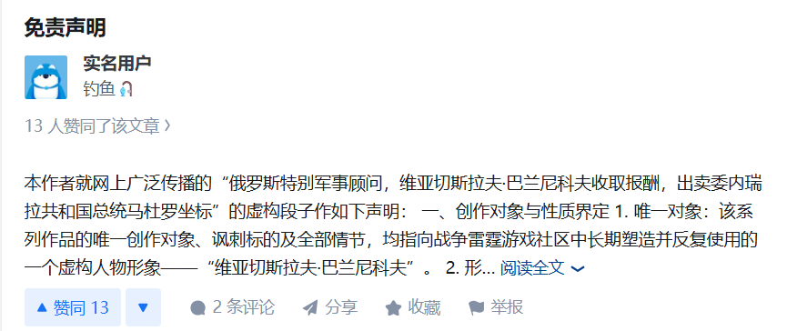 关键词搜索发现,所谓 “巴兰尼科夫用1美元交换情报”的说法至少在1月3日就已经出现。知乎用户“实名用户”在该平台关于“委内瑞拉总统及其夫人被美国强行控制意味着什么”的提问下发布回答,文中提到“巴兰尼科夫”,其叙述内容与随后在社交平台广泛传播的版本高度相似。但需要注意的是,该回答明确标注为“虚构创作”,并被收录在其个人的“bvvd宇宙”专栏之中。