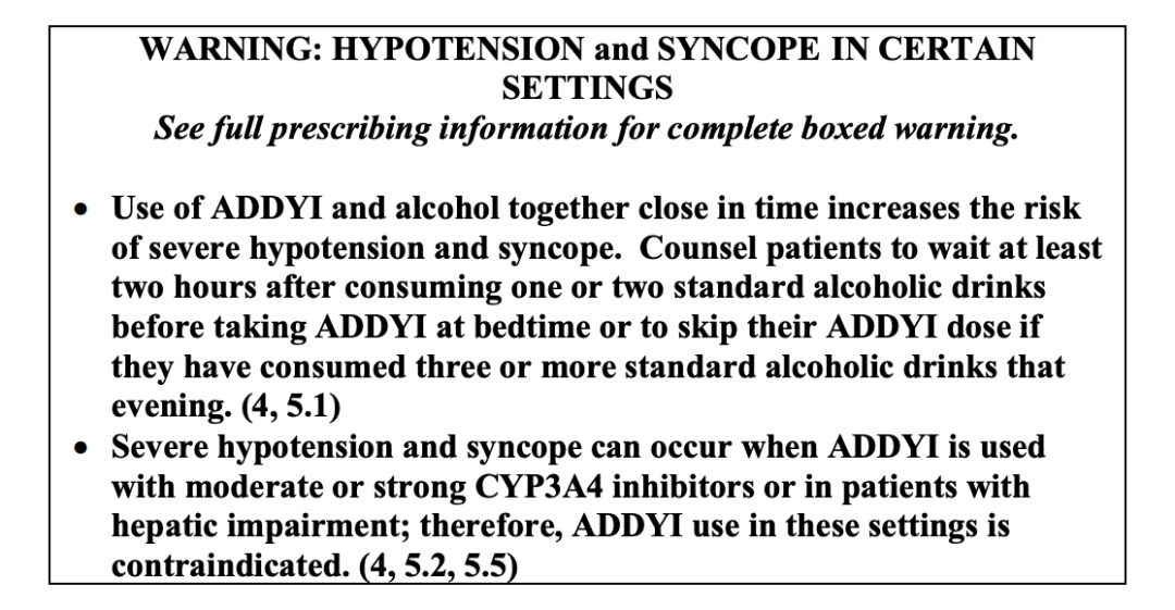 Addyi(氟班色林)的黑框警告。黑框警告(black box warning)指美国某些处方药的包装说明书上的一种警告格式,在FDA所有可能要求的警告形式中是最强烈的一种,意味着有医学研究指出服用该药物伴随着巨大风险,可能导致严重甚至危害性命的不良反应。图/美国食品药品监督管理局(FDA)官网