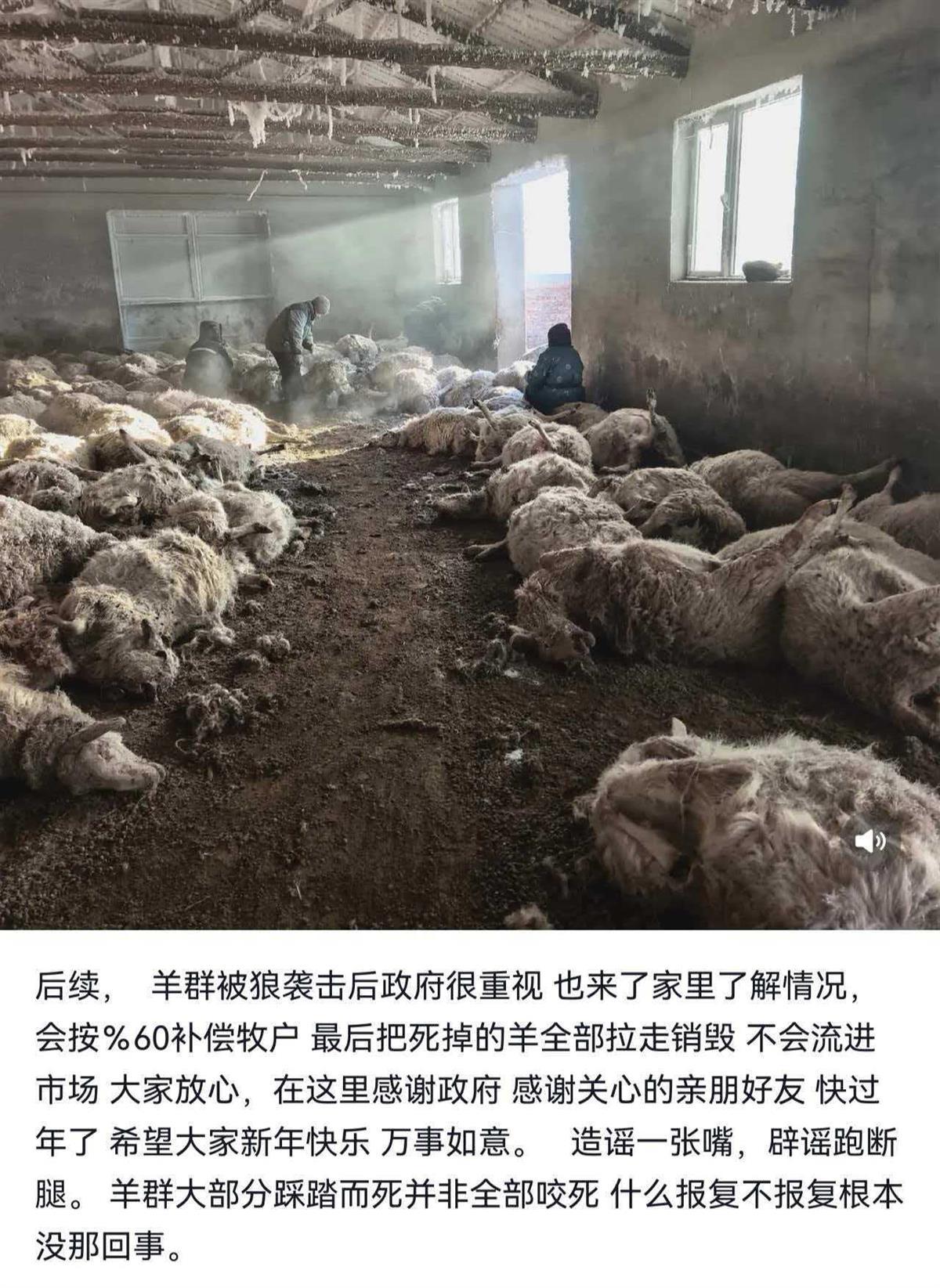 “造谣一张嘴,辟谣跑断腿。”该网友还说,羊群大部分因踩踏而死并非全部被咬死,什么狼群报复不报复根本没那回事。在这里感谢政府,感谢关心我们的亲朋好友,快过年了。