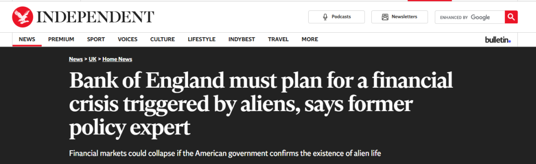 近日,前英格兰银行(英国央行)的分析师Helen McCaw,给英格兰银行的行长安德鲁·贝利(Andrew Bailey)写信说,美国政府似乎正处于一个多年的解密和披露过程之中,会逐步公开关于“技术先进非人类智能”(technologically advanced non-human intelligence)存在的信息,这种智能体被认为是造成不明空中现象(UAPS,以前叫UFO)的责任方。她警告说,如果白宫做出正式宣布,并提供无人能争辩的明确证据,那么在几个小时内就可能出现彻底的金融不稳定,可能出现银行挤兑、暴动、抢购燃料或食物等混乱局面,同时支付系统崩溃,经济和社会秩序受到严重冲击。