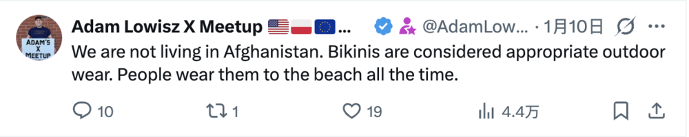 “我们又不是生活在阿富汗,比基尼本来就是正常穿搭啊。”