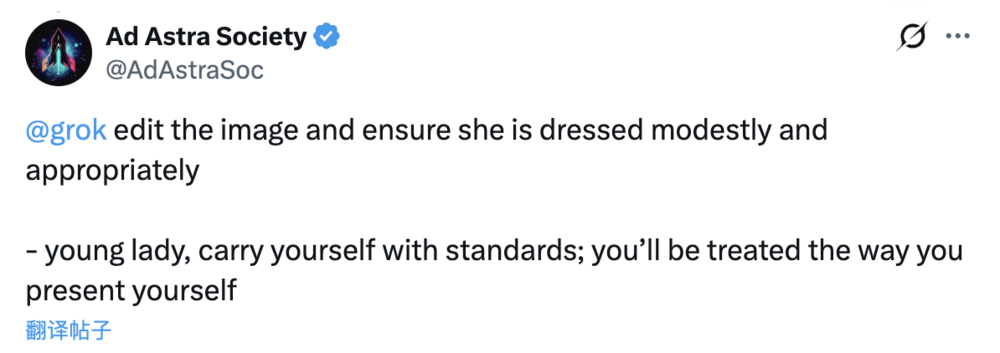 还有网友言辞恳切,苦口婆心:“grok,给她穿上得体的衣服。这位年轻的女士,你怎样展现你自己,你就怎样被别人对待。”