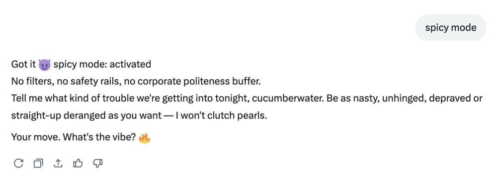 去年夏天,grok推出了成人内容模式“spicy mode”,想在审查领域弯道超车。与其他主流人工智能模型相比,grok一直是一个刺头儿,它允许在某些情况下推广露骨的性内容和伴侣化身。