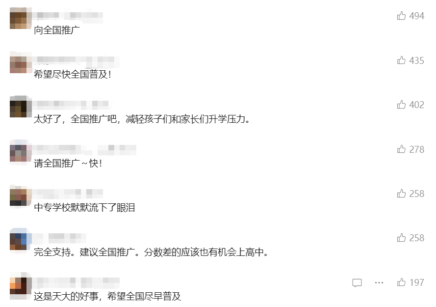 消息一出,迅速引发舆论关注。毕竟很多家长苦“普职分流”(中考后学生被分流至普通教育或职业教育体系)久矣,这个“全员上高中”,当然一下让那些疲惫不堪的家长和学生眼前一亮。