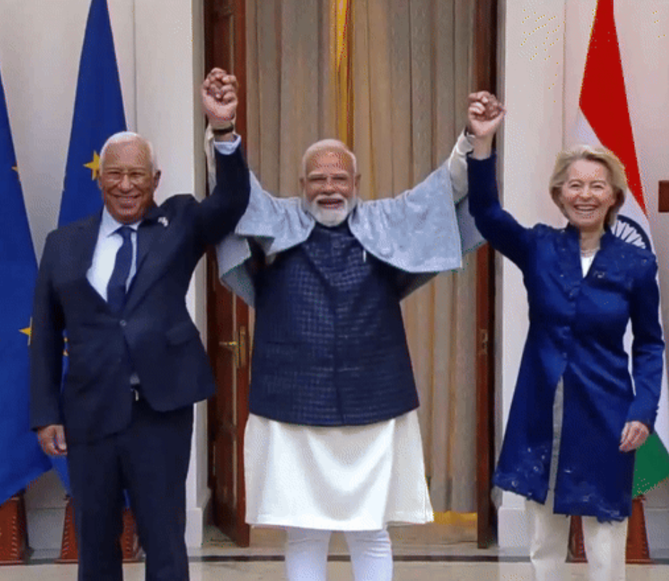当地时间1月27日,印欧领导人在新德里举行会晤。印度总理莫迪宣布,印度和欧盟达成自由贸易协定,并表示该协议覆盖全球GDP的25%和全球贸易额的三分之一。(总台记者 张玥 宋亮)