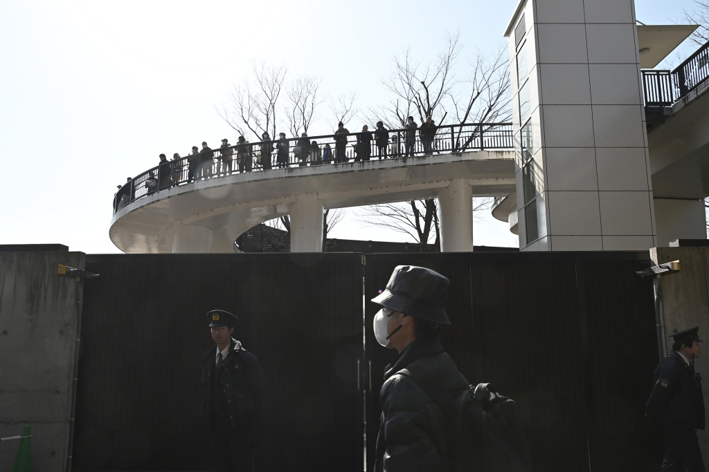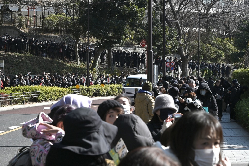 1月27日,日本东京,人们聚集在上野动物园附近,等待运载“晓晓”和“蕾蕾”的卡车经过。