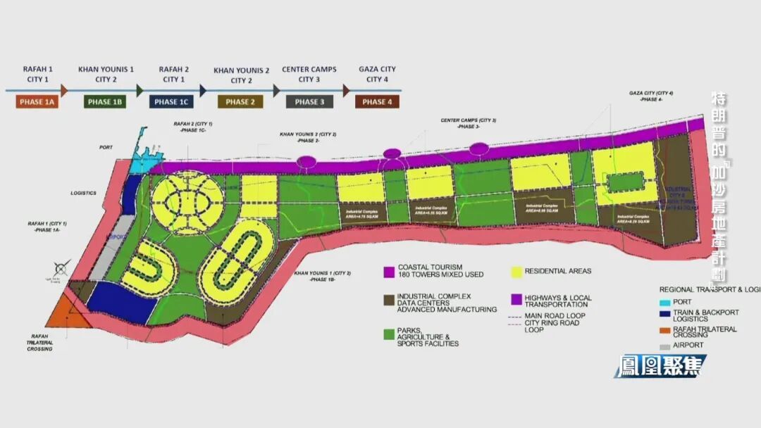 特朗普的新开发方案总体规划图显示了整个重建工作将分四个阶段进行,从南部的拉法开始,逐步向北推进到加沙城。规划图上划分了多个区域,包括沿海旅游区,那里将建有180座塔楼,此外,还有多个住宅区,工业园区,数据中心,先进制造业,以及公园、农业和体育设施。规划还显示,未来将在埃及边境附近建设一个新的海港和机场,并在埃及和以色列边境交汇处设立一个过境点。地图上还标出了一条沿着加沙边界延伸的空白地带,这似乎是目前以哈之间的安全警戒线。
