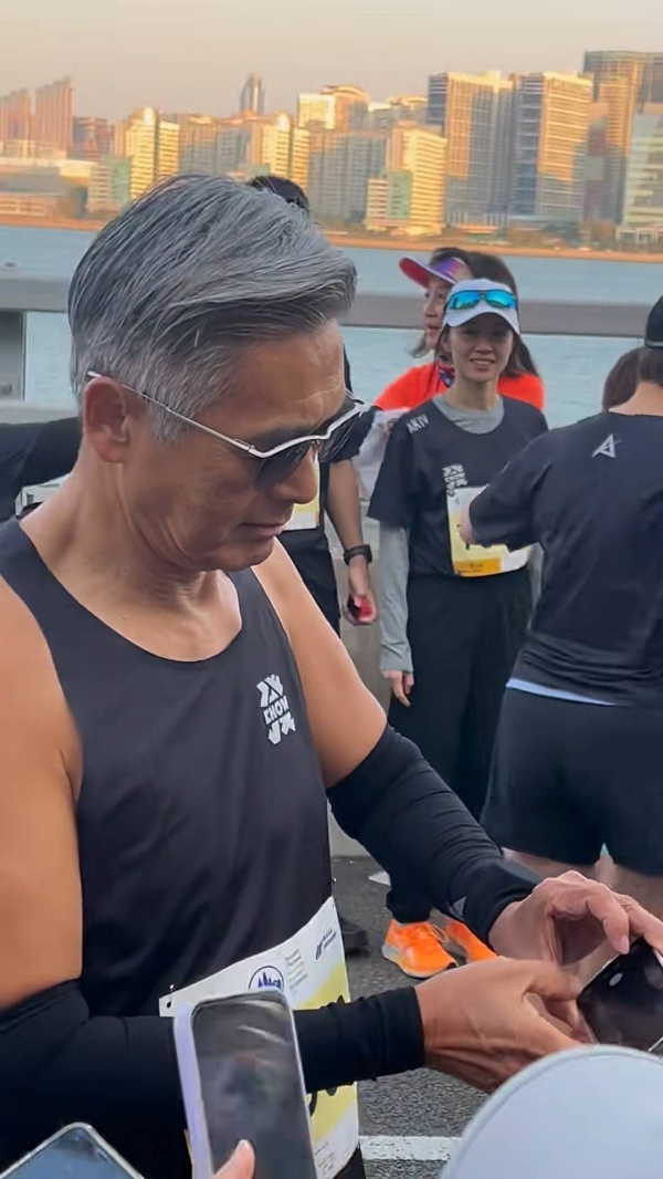现年70岁的周润发,已经是第四次参与渣打马拉松。尽管如此,他还是从去年的半马项目降格到10公里赛事,回归初心。发哥身穿黑色背心,编号T3936,在第七组起跑。刚一出现在东区走廊起跑点,就吸引了众多跑者的围观,大家纷纷向他请求合影。今天,发哥与鲍起静、郑则仕一同参赛,笑称加埋几百岁,最终用时2小时完成了赛事。他表示:我不是志在成绩,而是志在完成,并希望借此活动向大家传递一个讯息:即使年纪大了,依然可以像我们一样跑步,保持活力。
