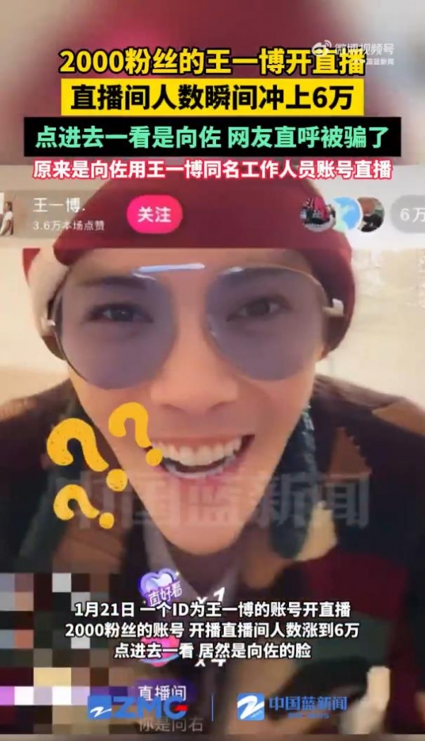 原来,向佐这次用的是自己团队里一名工作人员的同名微博账号直播。这个账号ID正好叫"王一博",但跟那位粉丝千万的明星王一博没有半毛钱关系。就因为这个名字,大批网友被"精准误导",蜂拥而入,直播间点赞量也飙到3.6万次。等大家反应过来主播是向佐,评论区立马被"被骗了"、"走错片场了"刷屏,话题#向佐用王一博同名账号开直播#也火速登上热搜。