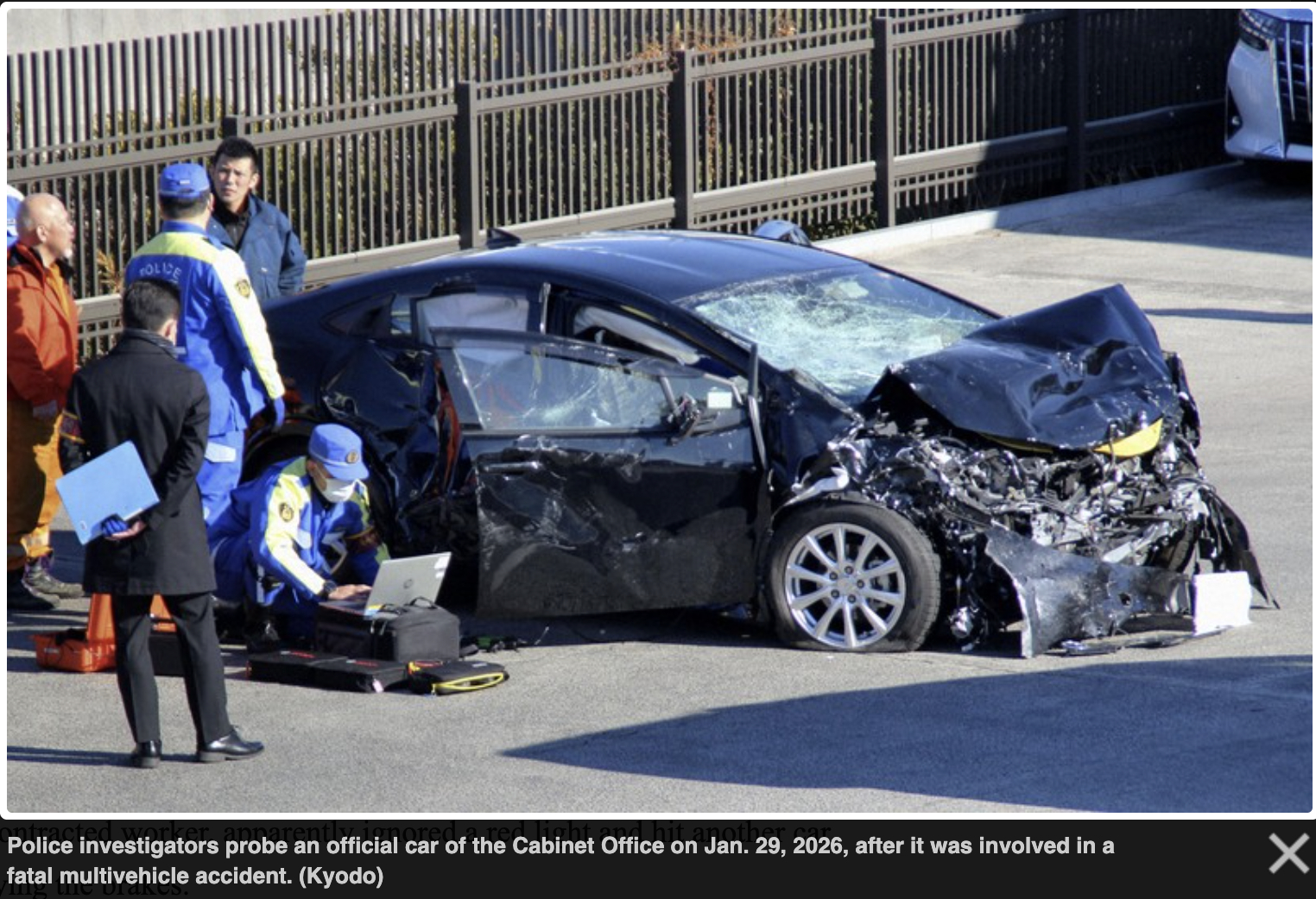 有调查知情人士透露,这起涉6车的交通事故发生在1月22日,涉事的内阁官房公务车驶离首相官邸约30秒后,便与另一车辆发生相撞。该公务车后座载有两名50多岁男性乘客,疑似在交通信号灯变红68秒后驶入事发路口。