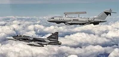 资料图:瑞典萨博公司研发的“全球眼”空中预警机(上)和“鹰狮”E战斗机(来源:中国国防报)