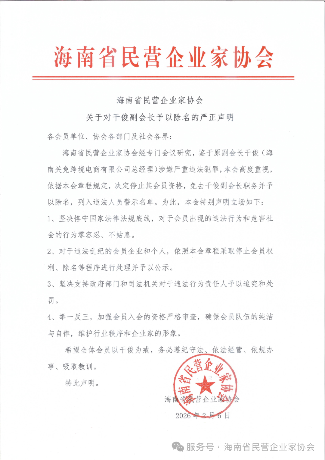 海南省民营企业家协会经专门会议研究,鉴于原副会长干俊(海南关免跨境电商有限公司总经理)涉嫌严重违法犯罪,本会高度重视,依据本会章程规定,决定停止其会员资格,免去干俊副会长职务并予以除名,列入违法人员警示名单。