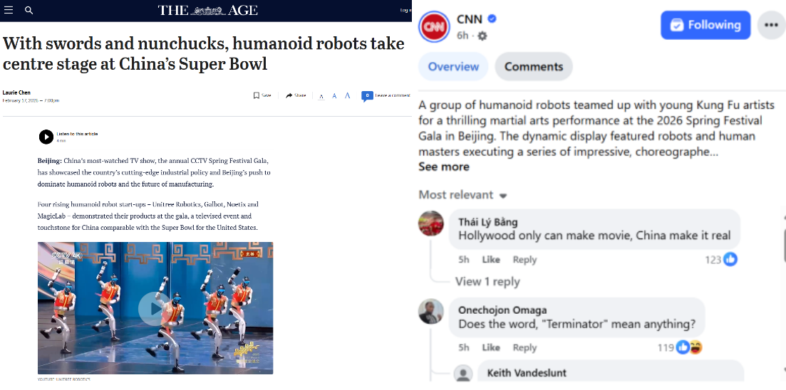 截至2月17日19时,总台通过85种语言对外传播平台向全球直播和报道春晚。CGTN(中国国际电视台)春晚相关报道全球阅读量达23.09亿次,总台联动全球近4000家媒体对春晚进行同步直播和报道,全球98个国家、140座城市的4062块公共大屏直播和宣介总台春晚。外媒报道最集中的两个关键词是“难以置信”和“大放异彩”,认为中国春晚的机器人表演不仅是技术突破,更是中国科技实力的集中展示: