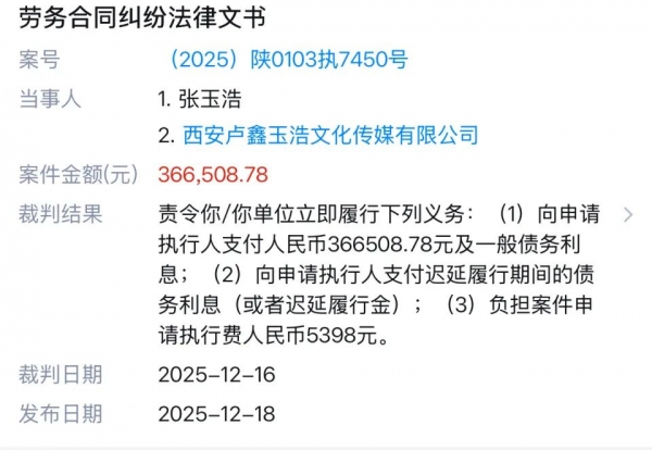 此前,2025年9月10日,张玉浩因劳务合同纠纷,向碑林区法院申请对西安卢鑫玉浩文化传媒有限公司执行,案号(2025)陕0103执7450号。申请执行内容为,36.65万元及一般债务利息;支付迟延履行期间的债务利息;负担案件申请执行费5398元。