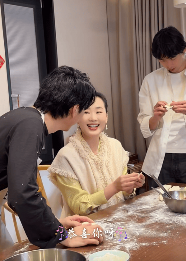 写完春联,吃了饺子的林依轮一家,他们开始录制新年歌曲,林依轮和妻子西华负责唱歌,俩儿子则充当背景板在后面舞狮,一家四口在一起的家庭氛围温馨又欢乐。