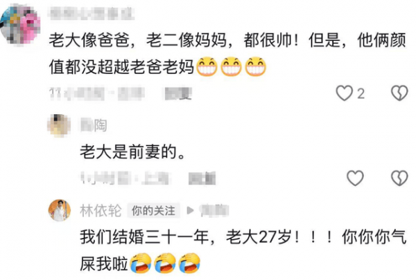 而在这条评论下有网友还表示林依轮大儿子并不是他与西华生的,而是与前妻生的,没想到林依轮还回应了,他写道:"我们结婚三十一年,老大27岁,你气死我啦",由此可见大儿子也是他和西华所生。