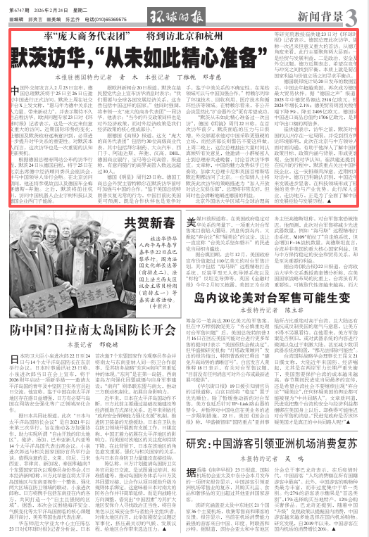 中国外交部发言人2月23日宣布,德国总理默茨将于25日至26日应邀对中国进行正式访问。默茨上周在社交平台X上发文称,“愿马年为德中关系注入力量、带来新动力”,并表示期待不久后启程访华。欧洲问题专家23日对《环球时报》记者表示,这是一次迟来但意义重大的访问,近期国际形势的变化,让德国及默茨政府逐渐意识到,必须进一步提升对华关系的重要性。对默茨本人而言,这次访华也是一次重要的认知更新契机。