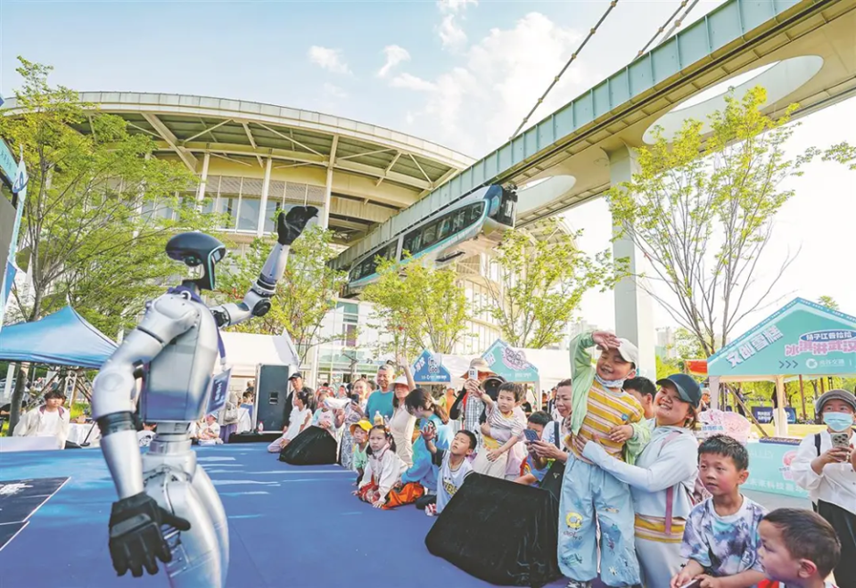 2025年5月1日,在武汉光谷空轨高新大道站,人形机器人与游客互动。湖北日报全媒记者 魏铼 摄