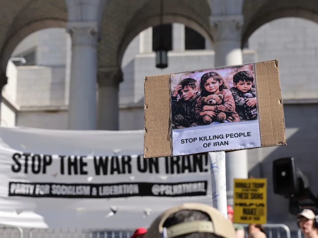3月7日,在美国加利福尼亚州洛杉矶市政厅前,人们参加集会抗议美国和以色列对伊朗发动军事打击。/图源:新华社 邱晨摄