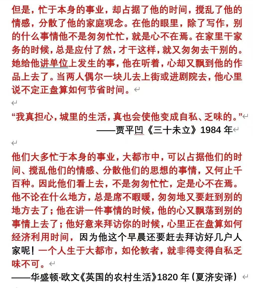 他把贾平凹《三十未立》(1984年)的段落,和美国文学之父华盛顿·欧文《英国的农村生活》(1820年,夏济安译)放在一起。