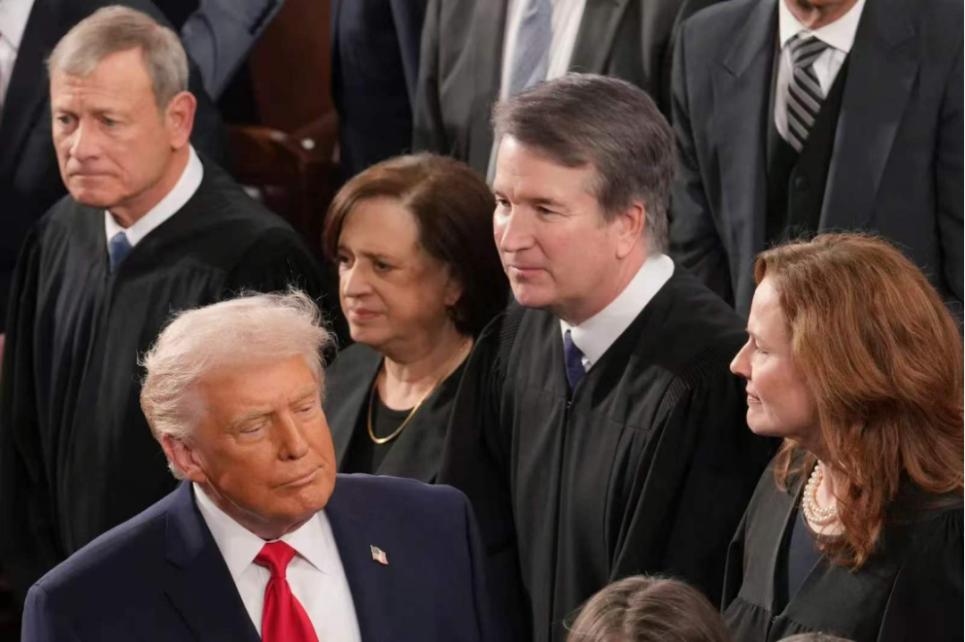 ◆2月24日,特朗普在国会众议院发表国情咨文前,与最高法院数位大法官擦肩而过。(图源:美联社)