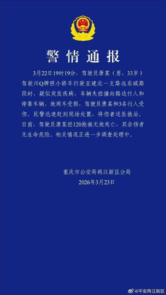 23日0时许,极目新闻记者从重庆警方获悉,3月22日19时19分,驾驶员唐某(男,33岁)驾驶川Q牌照小轿车行驶至建北一支路远东城路段时,疑似突发疾病,车辆失控撞向路边行人和停靠车辆,致两车受损,驾驶员唐某和3名行人受伤。民警迅速赶到现场处置,将伤者送医救治。