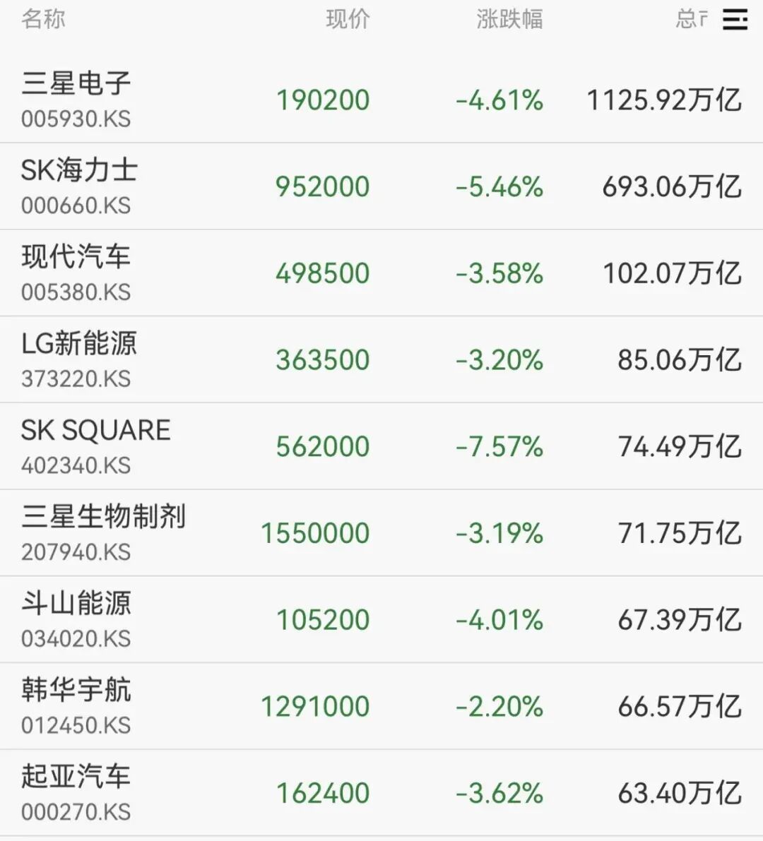 权重股方面,SK海力士股价现跌超5%,报95.2万韩元。三星电子、现代汽车、LG新能源等跟跌。