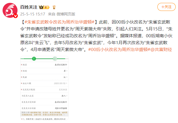 5月15日,“朱雀玄武敕令”发帖称已经成功改名为“周乔治华盛顿”。据媒体报道,00后湖南小伙原名叫“朱云飞”,去年5月改名为“朱雀玄武”,今年1月再次改名为“朱雀玄武敕令”,4月申请更名“周天紫微大帝”。