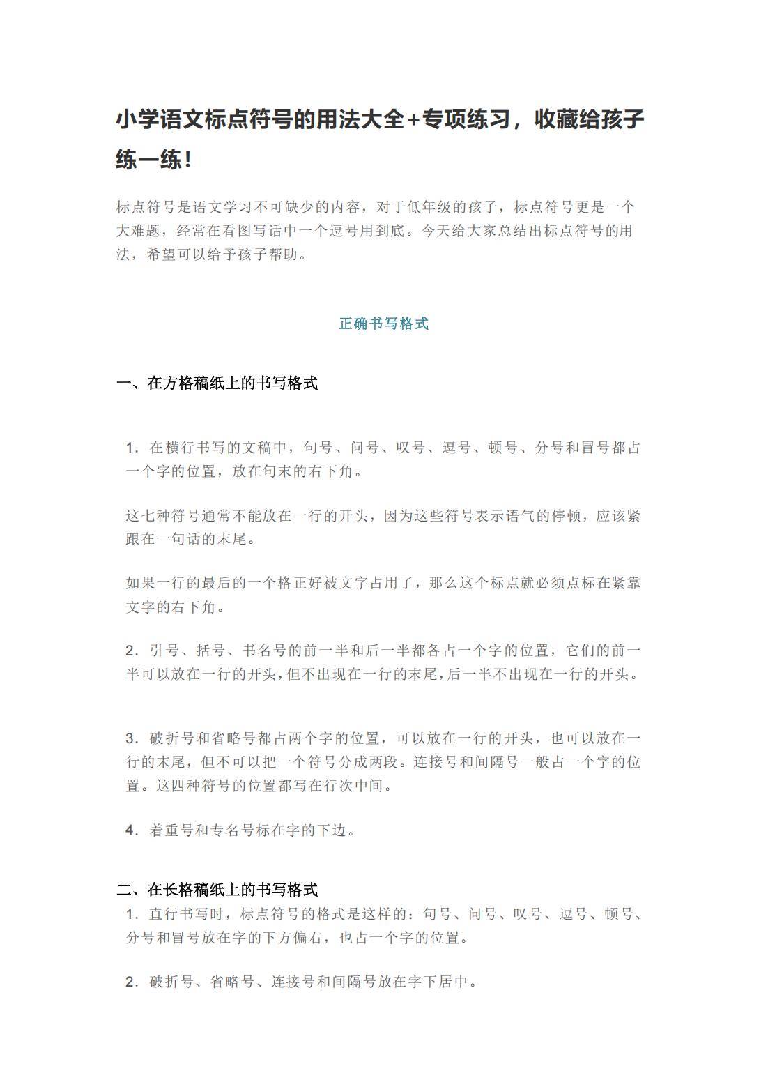 今天为大家分享:语文标点符号用法大全+专项练习14页,主要涵盖标点符号的正确书写格式,包括在方格稿纸和长格稿纸上的书写规范,详细说明了句号、问号等点号,以及引号、括号等标号的占位和书写位置要求,还配有示例和注意事项。