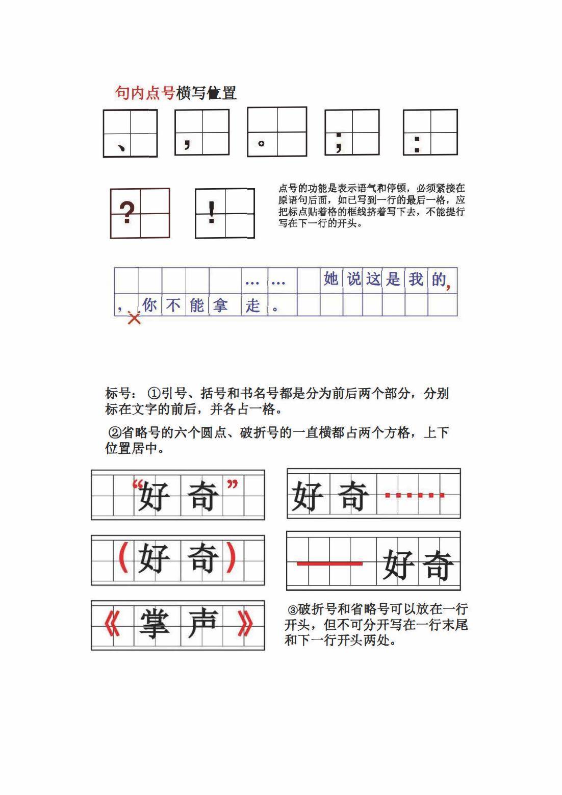 通过明确不同稿纸中标点符号的书写格式,学生能避免书写错误,养成规范书写习惯。直观的示例展示,让学生更易理解和掌握标点符号的正确写法。规范书写标点符号,不仅能提升书面表达的规范性和美观度,还有助于准确表意,为学生今后的语文学习和写作奠定良好基础,使其在语文表达中更加严谨、专业。