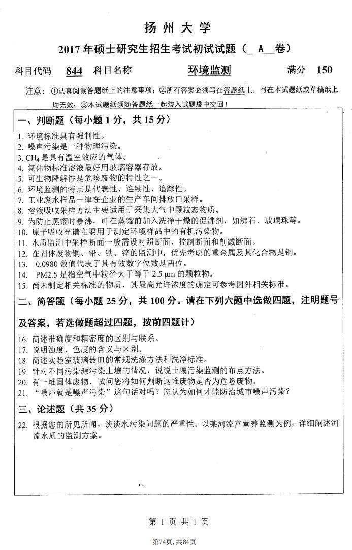 2017年扬州大学844环境监测考研真题试卷