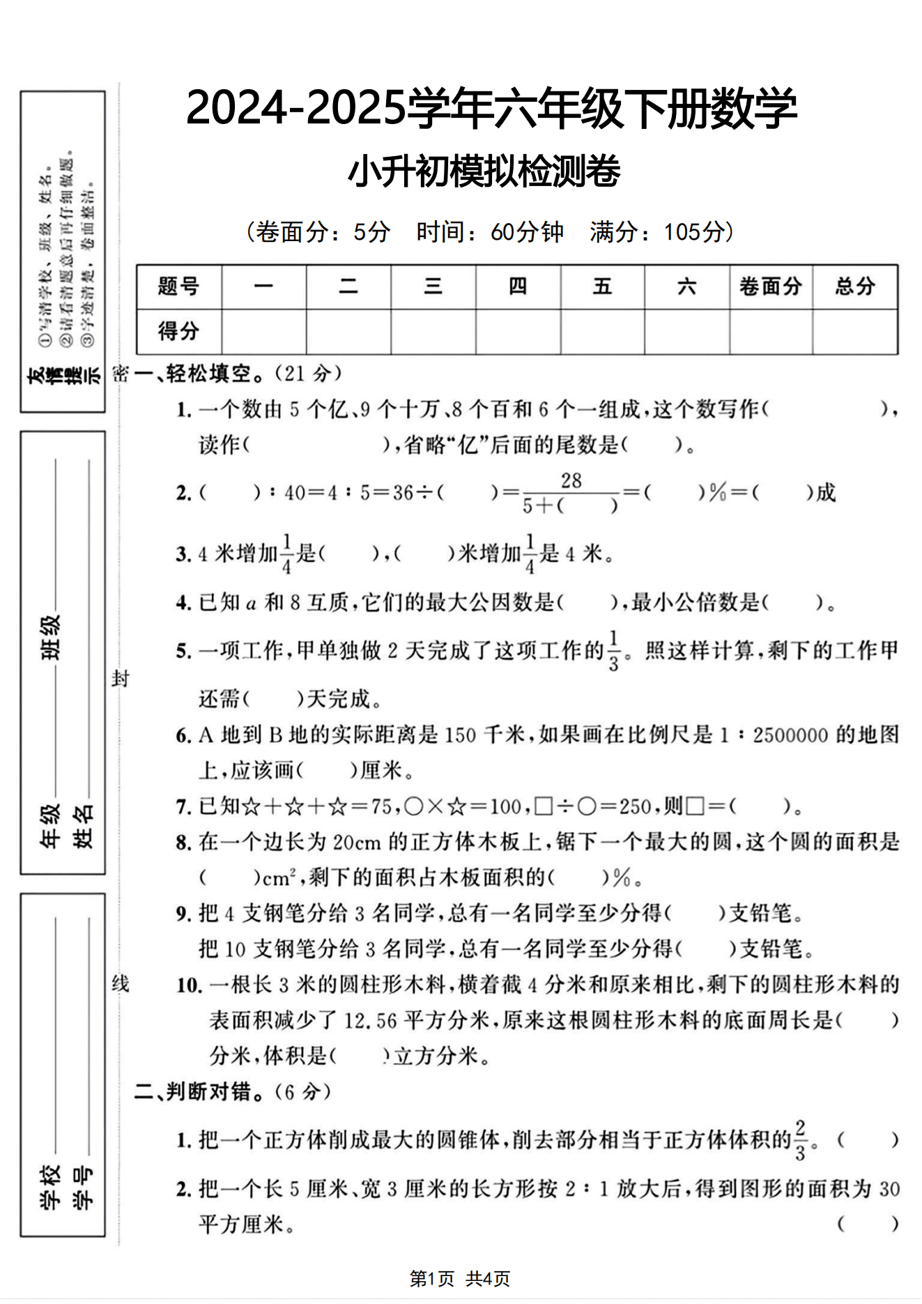 它涵盖了数的读写、运算、图形、统计等丰富知识点,从基础填空、判断选择,到复杂计算、应用题,全面考查大家对数学知识的掌握与运用。通过这份试卷,同学们可以提前熟悉考试题型,发现知识短板,为顺利升入中学筑牢数学根基。