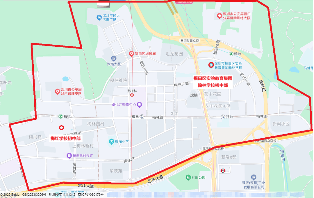 梅红学校初中部、福田区实验教育集团翰林学校初中部实行共享学区制。