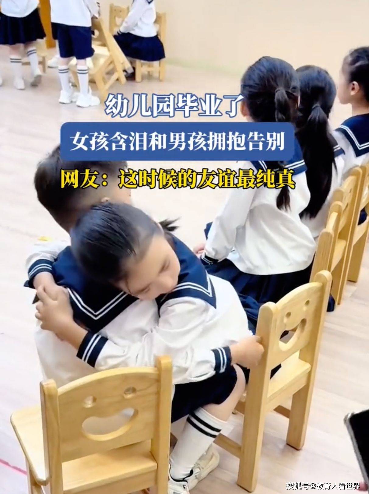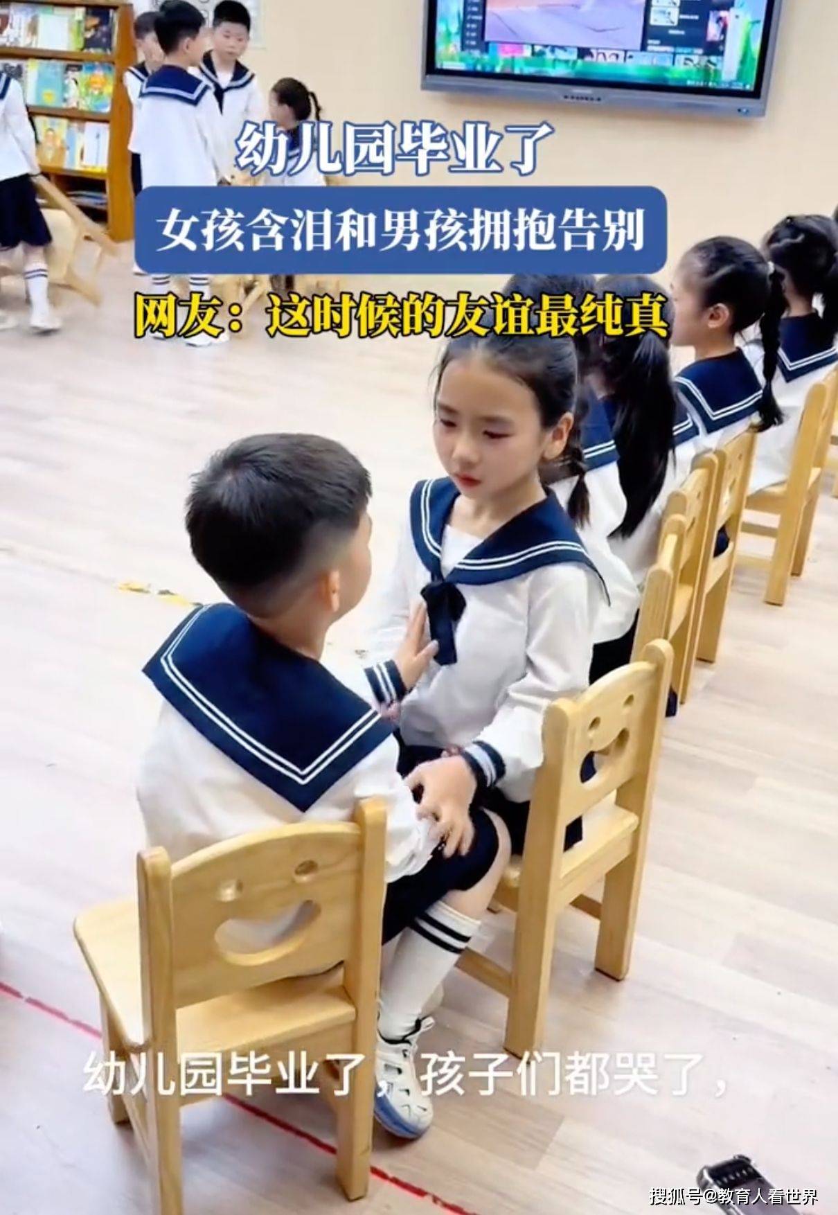 5月15日,浙江某幼儿园,毕业典礼后。小男孩将凳子搬到女孩旁边坐着。小女孩含泪看着男孩,抱着小男孩不撒手,老师举着手机录像的手直抖——这画面传到网上,评论区比毕业典礼还热闹。有家长喊着"定亲宴赶紧安排",有网友调侃"这是人生高光时刻",更有人翻出二十年前的QQ签名:"非XX不嫁"。可当我们的视线穿过这些或戏谑或怀旧的弹幕,真该问问自己:那个紧紧拥抱的小姑娘和红着眼眶的小男孩,他们抱在一起的瞬间,究竟藏着多少被我们忽略的教育密码?