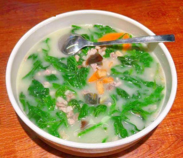 ④锅中汤汁浓稠一点的时候放入枸杞芽,加少许的盐,煮一会儿就可以食用了。