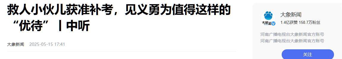 大象新闻2025年05月15日——救人小伙儿获准补考,见义勇为值得这样的“优待”丨中听