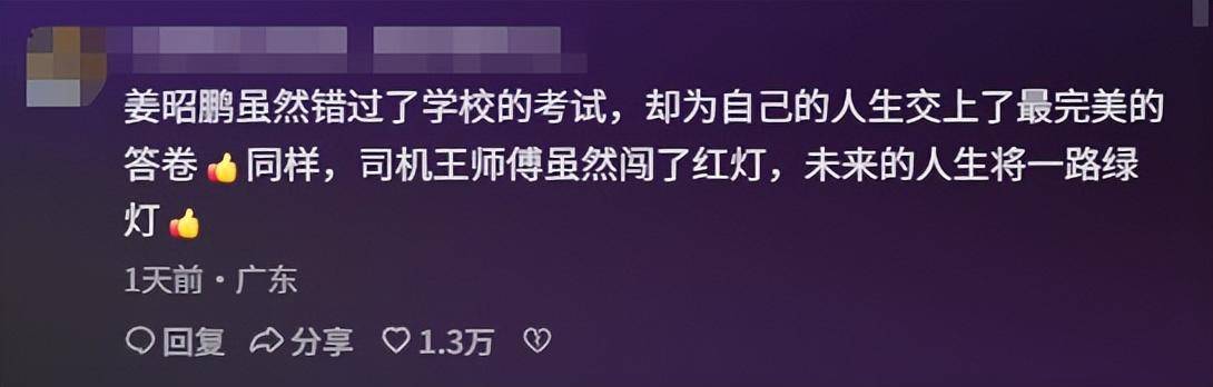 “姜昭鹏虽然错过了学校的考试,却为自己的人生交上了最完美的答卷,同样,司机王师傅虽然闯了红灯,未来的人生将一路绿灯。”