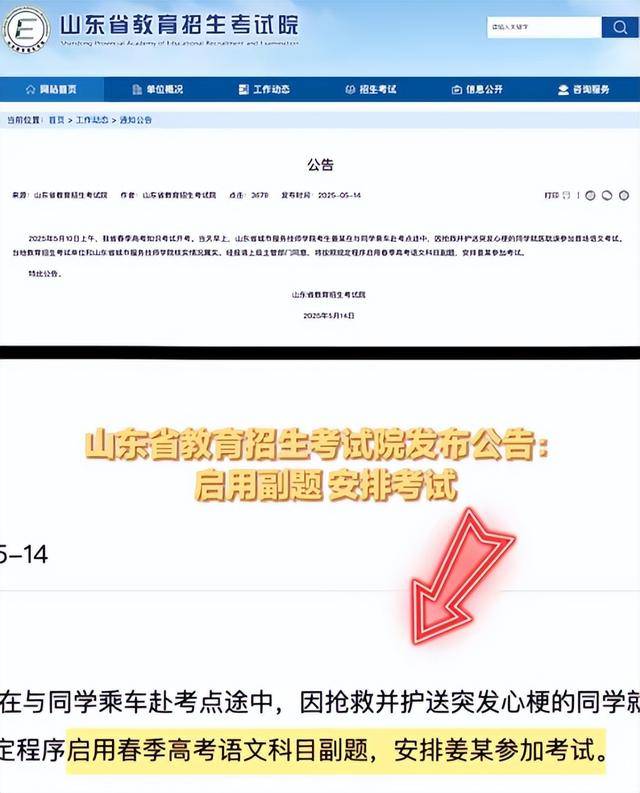 14日,山东省教育招生考试院发布公告:经上级批准,将启用春季高考语文科目副卷为其安排补考,同日,烟台市授予姜昭鹏和司机王涛“见义勇为先进个人”称号。