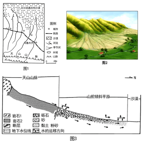 材料二图1为天山北麓部分地区略图。图2为洪积一冲积扇示意图。图3为天山北麓一古尔班通古特沙漠某剖面示意图。