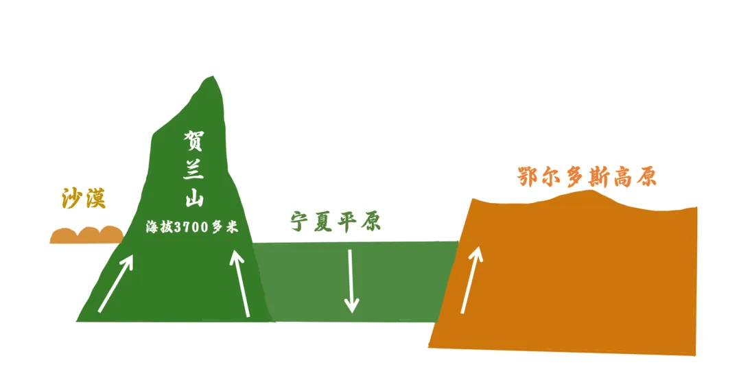 既削弱了西北高寒气流的东袭,遏制了腾格里沙漠的东移,阻挡了风沙入侵宁夏平原;也阻止了潮湿的东南季风西进,同时贺兰山东坡为东南季风的迎风坡,地形雨丰富,增加了平原水源补给;且贺兰山东坡夏季地表径流含沙量大,增加了平原土壤厚度和肥力。